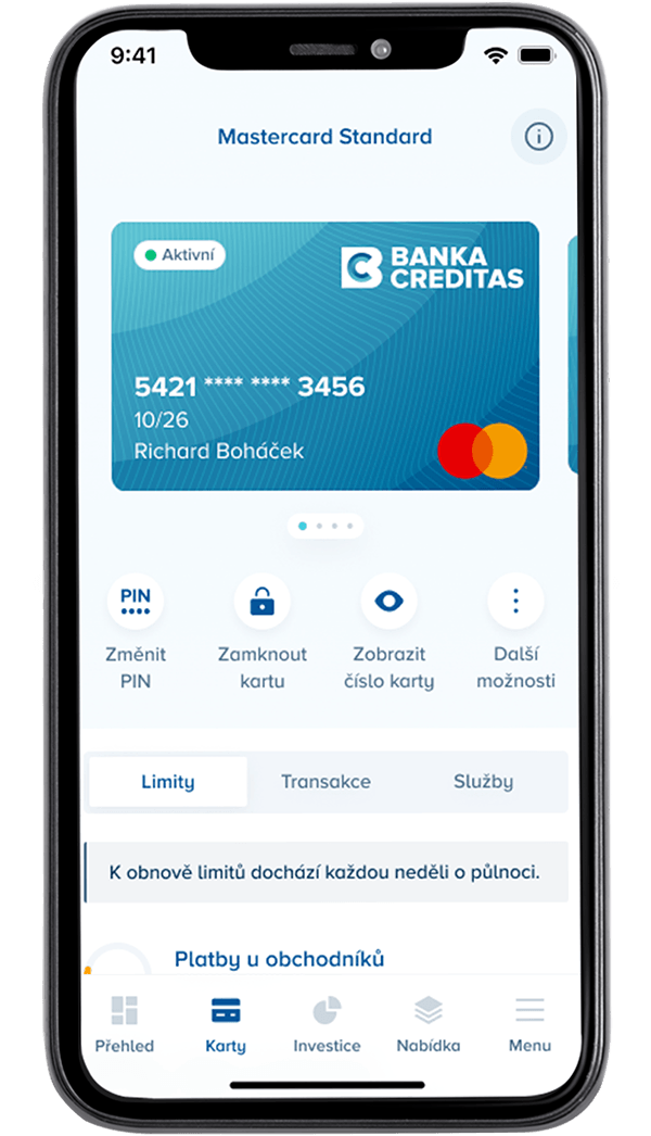 Své karty můžete jednoduše spravovat od samotné aktivace po nastavení jednotlivých limitů, PINu a ePINu. V případě ztráty či odcizení můžete provést okamžitou blokaci.