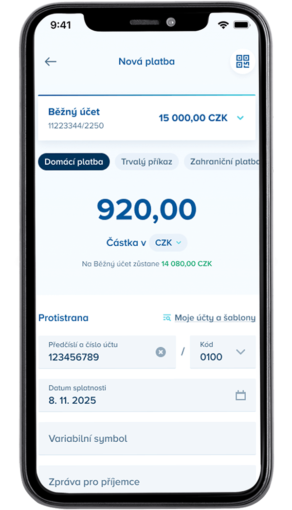 S mobilní aplikací CREDITAS One máte plnou kontrolu nad svými platbami. Spravujte trvalé příkazy, realizujte domácí i zahraniční platby v EUR a využijte šablony pro ještě pohodlnější placení.